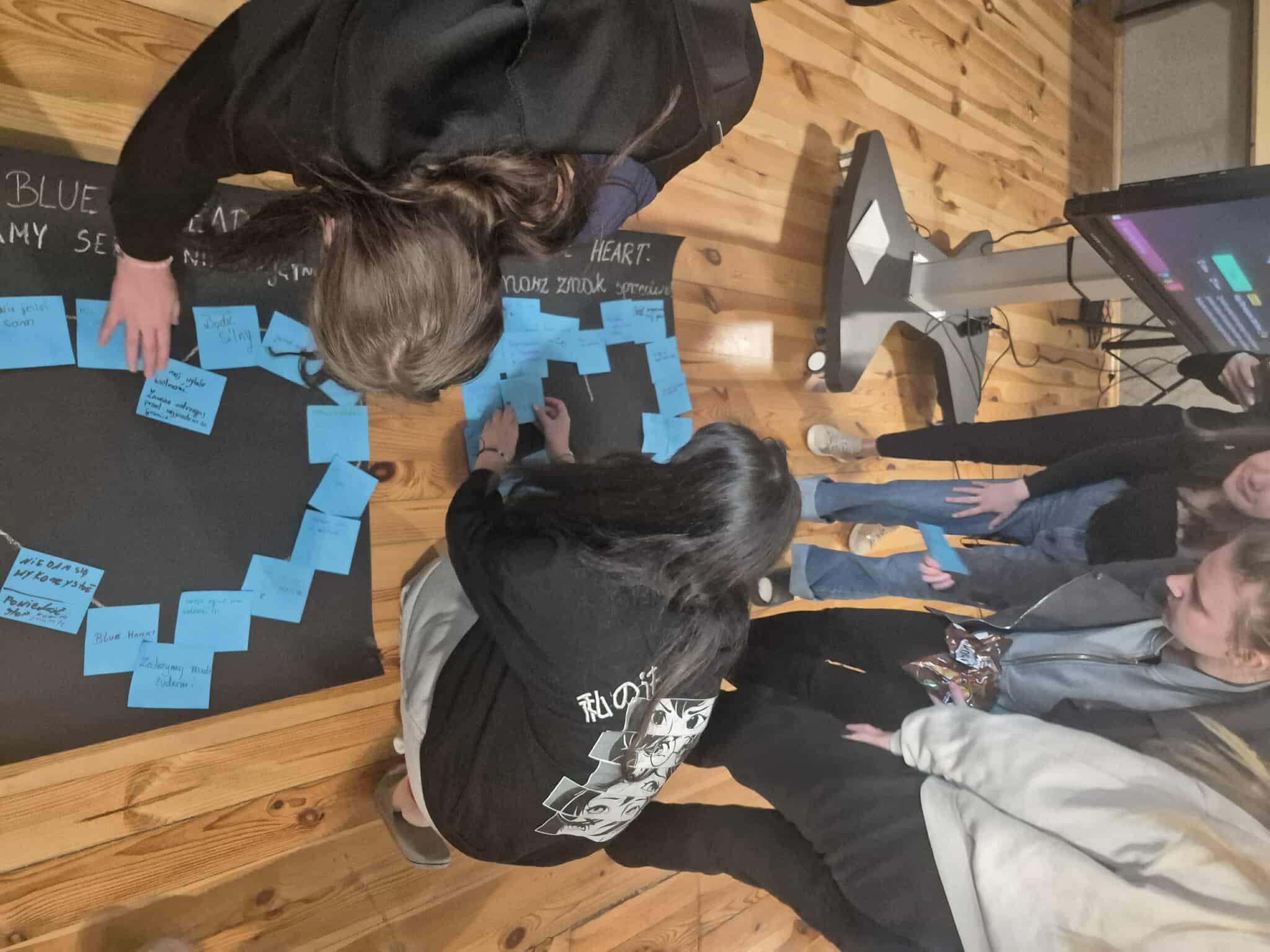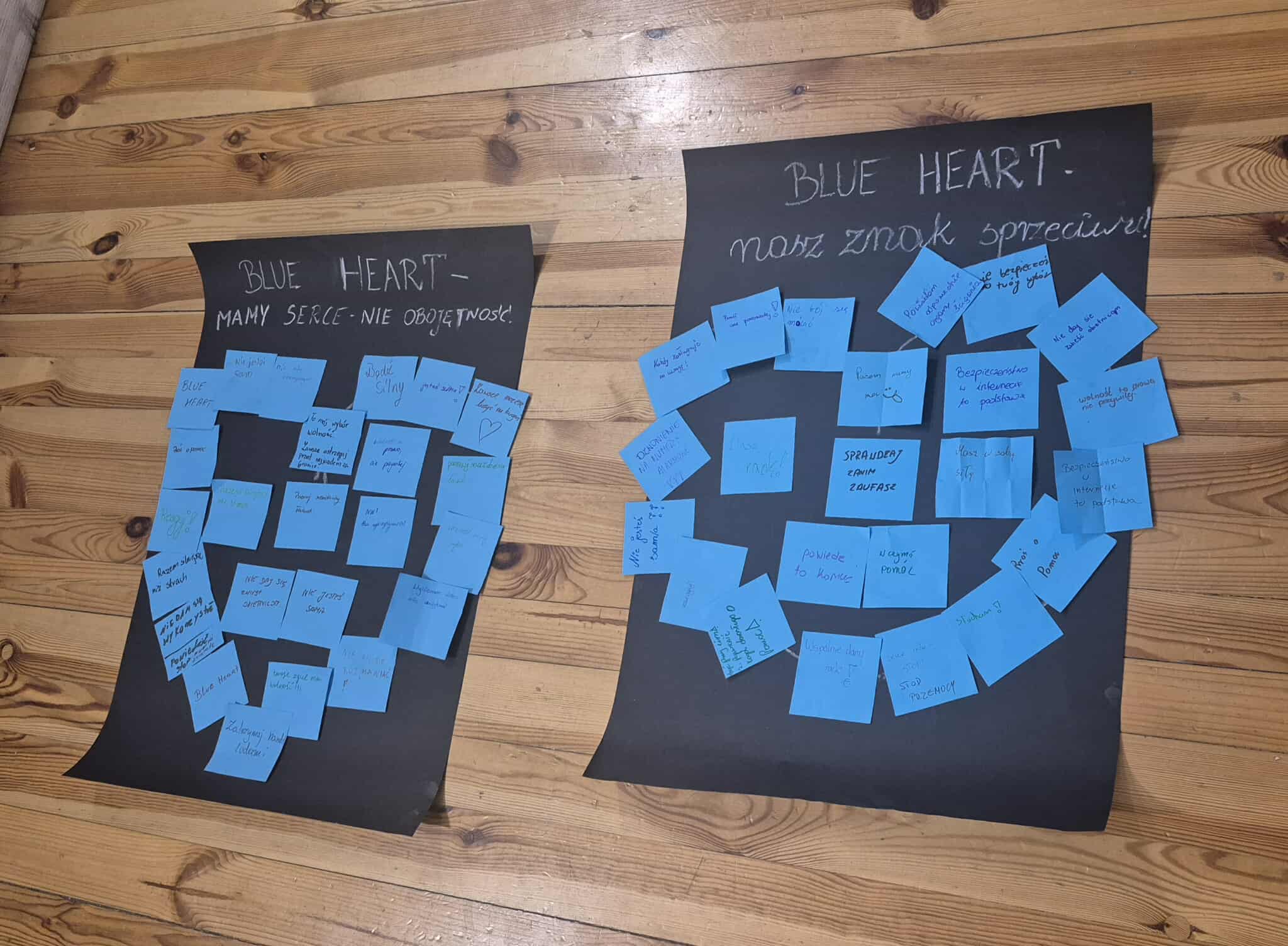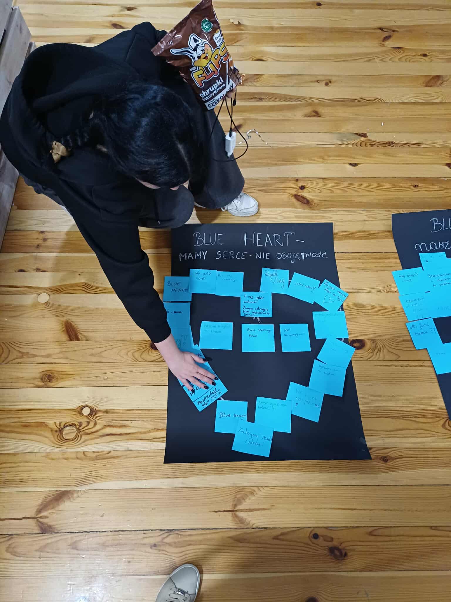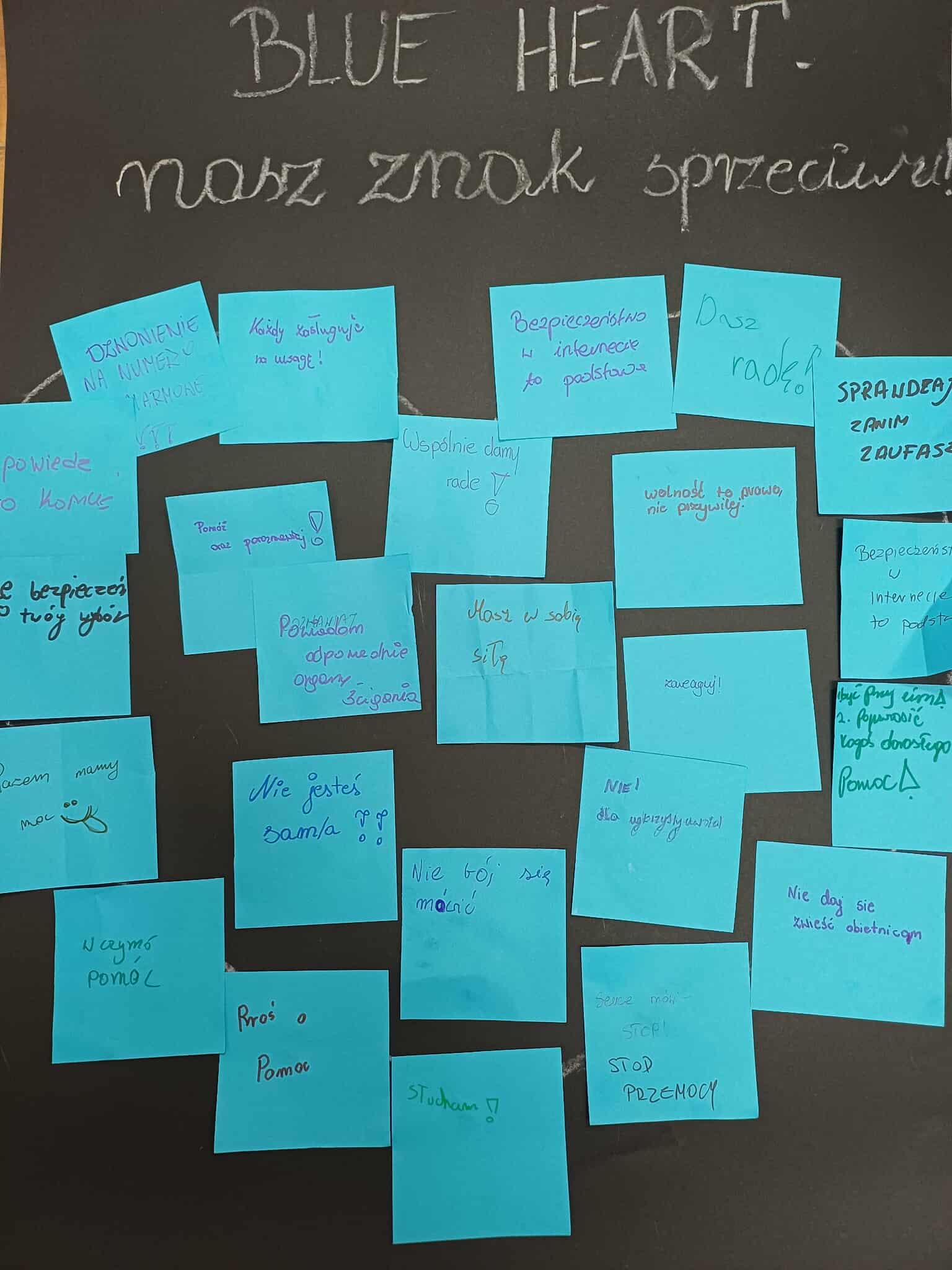 – Blue Heart! Rozpoczęłyśmy zajęcia od obejrzenia krótkiego reportażu, który pokazał, jak rozpoznawać zagrożenia, jak się chronić i gdzie szukać pomocy w przypadku handlu ludźmi. Następnie odbyła się dyskusja oraz zajęcia warsztatowe. Odpowiadałyśmy na ważne pytania i umieszczałyśmy swoje przemyślenia na niebieskich karteczkach , które stały się symbolem solidarności i wsparcia. Na zakończenie nasza sala gimnastyczna zamieniła się w małą salę kinową, gdzie wspólnie obejrzałyśmy film „Uprowadzona”, poruszający tematykę handlu ludźmi.