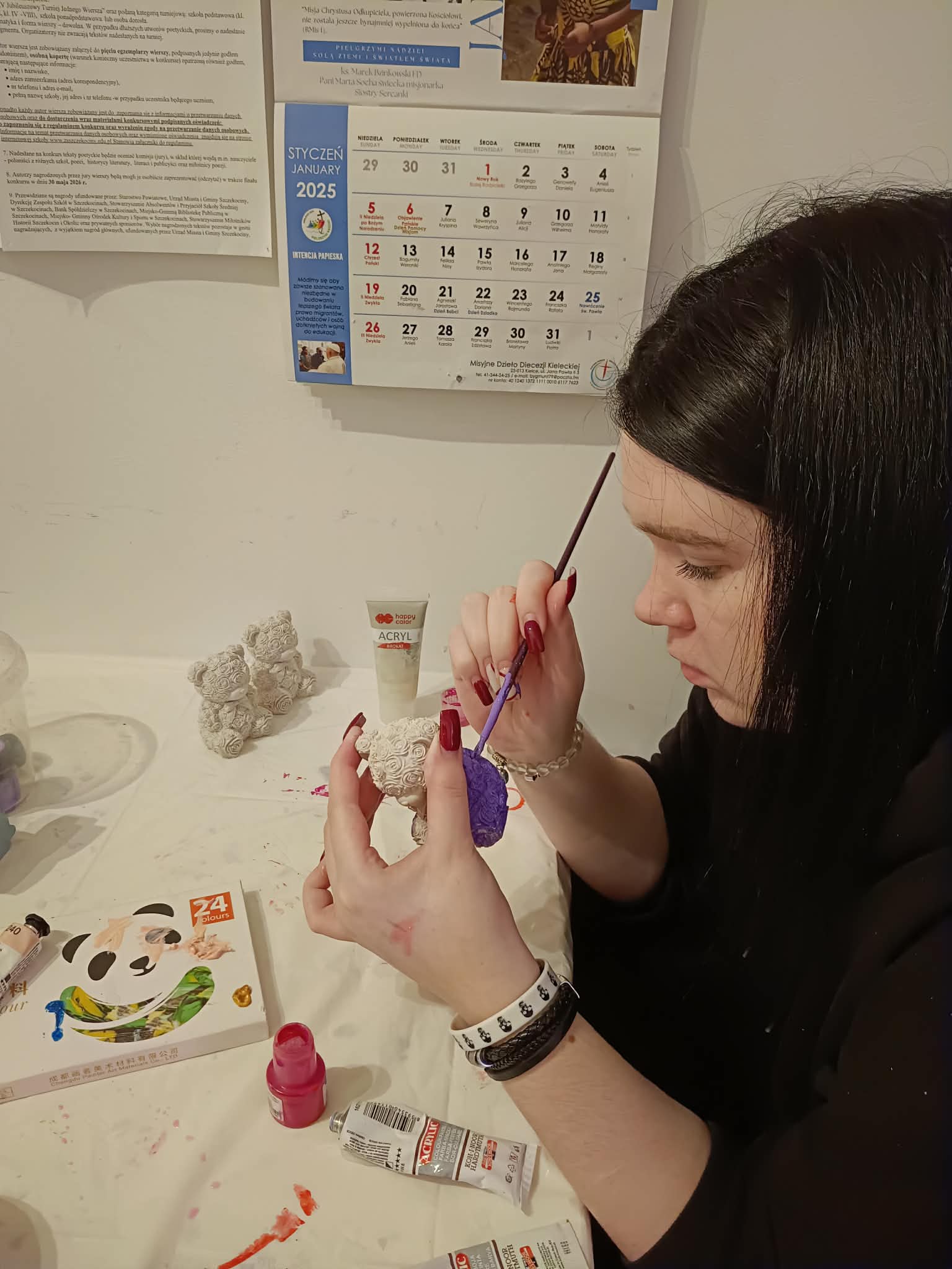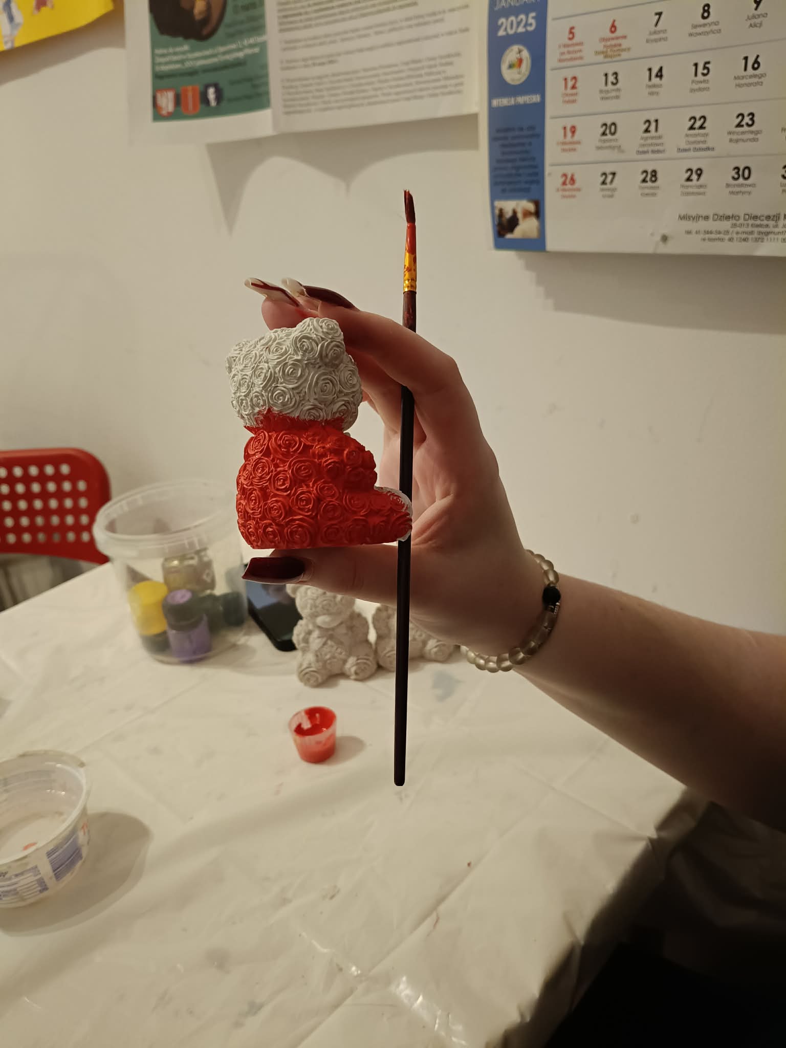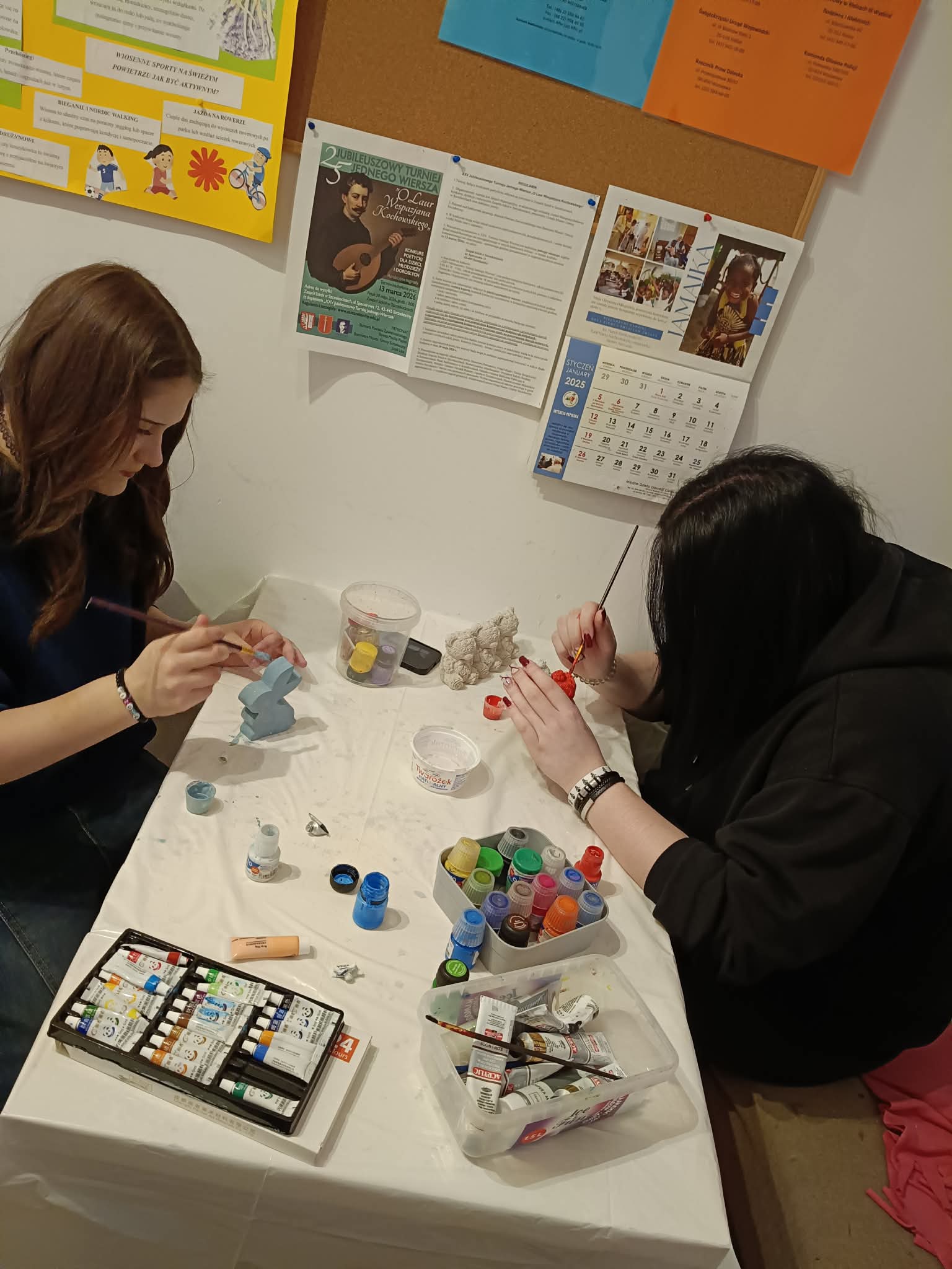 W trakcie zajęć plastycznych malowałyśmy odlane wcześniej przez nas figurki gipsowe.