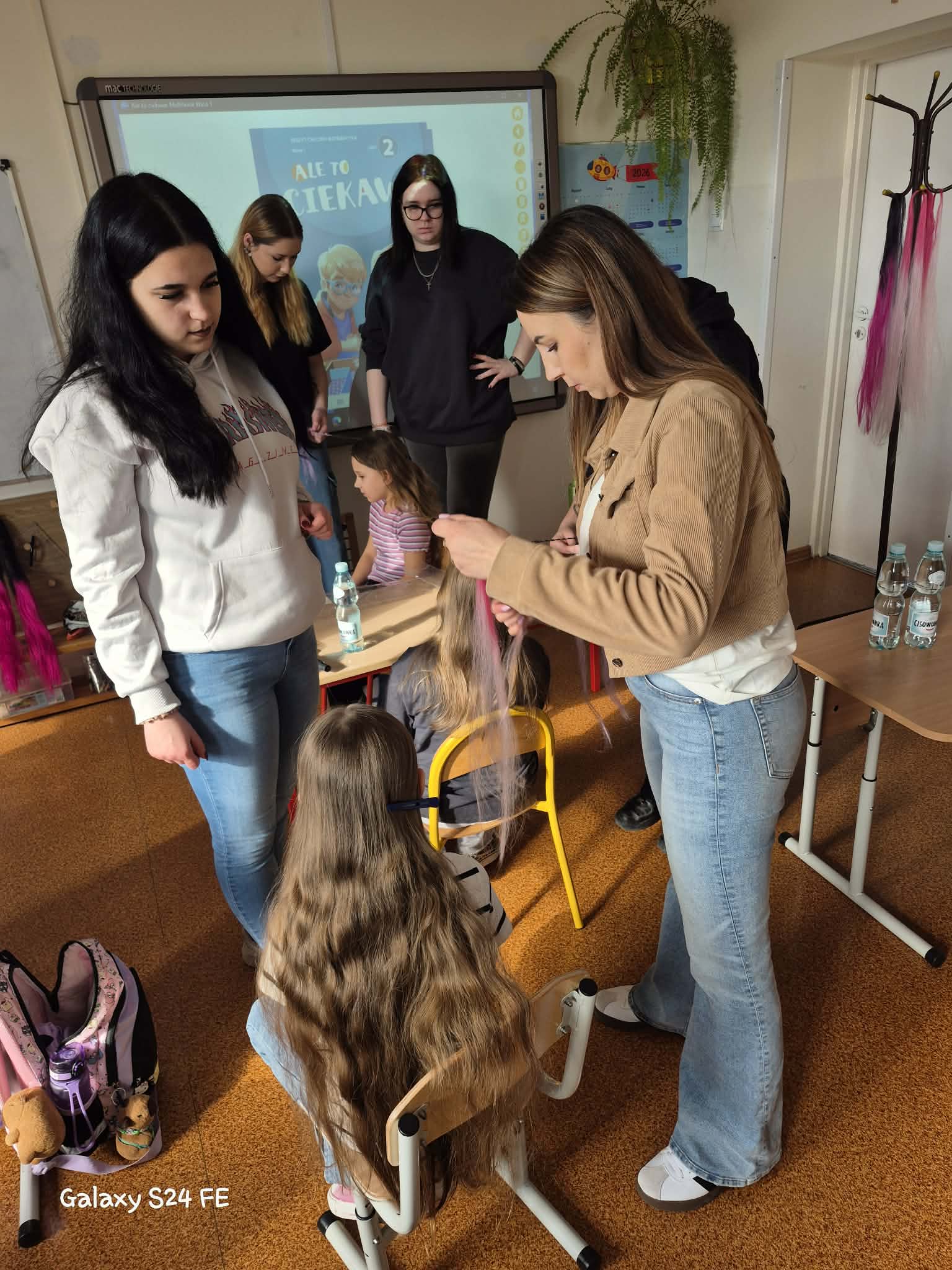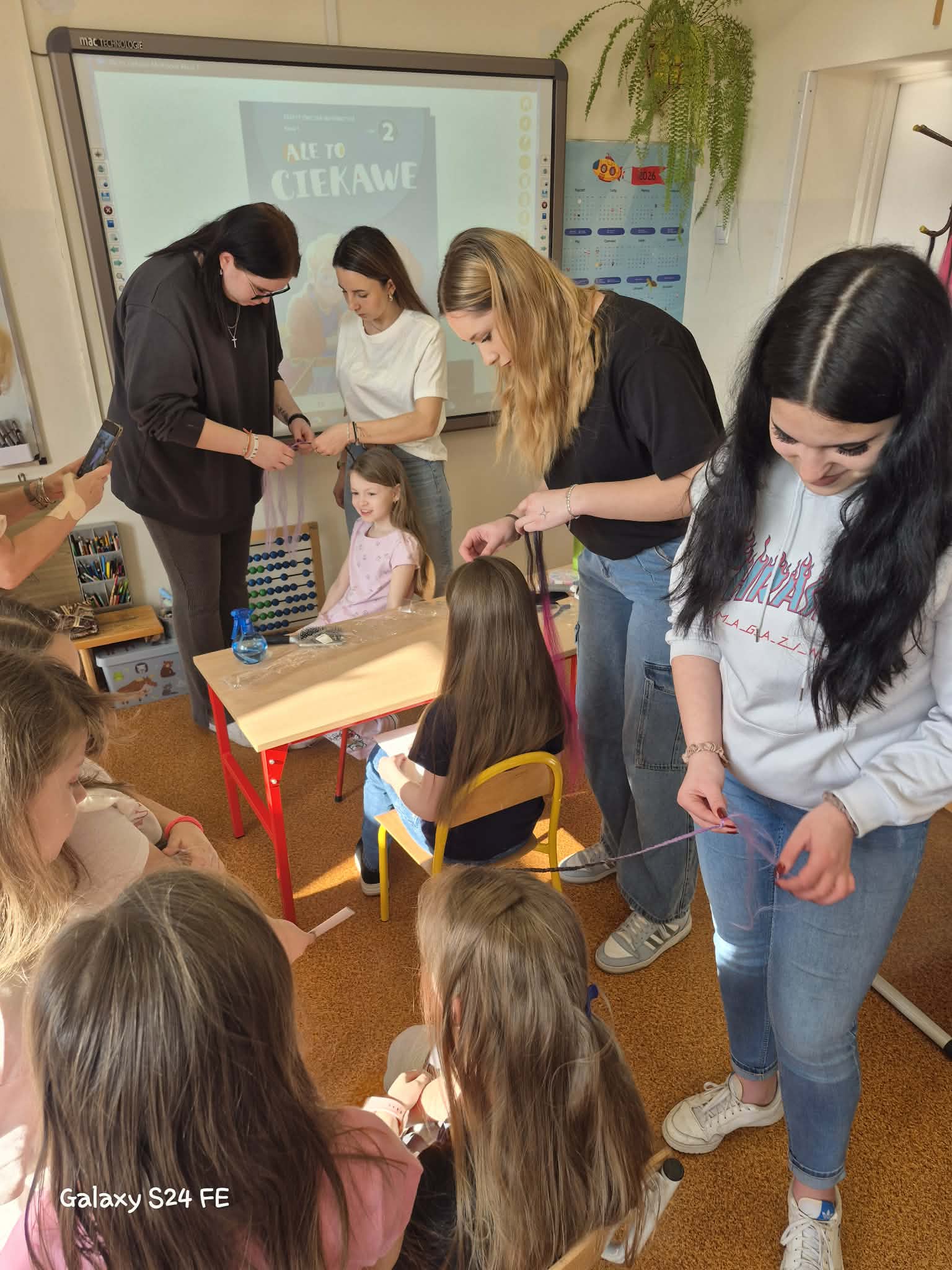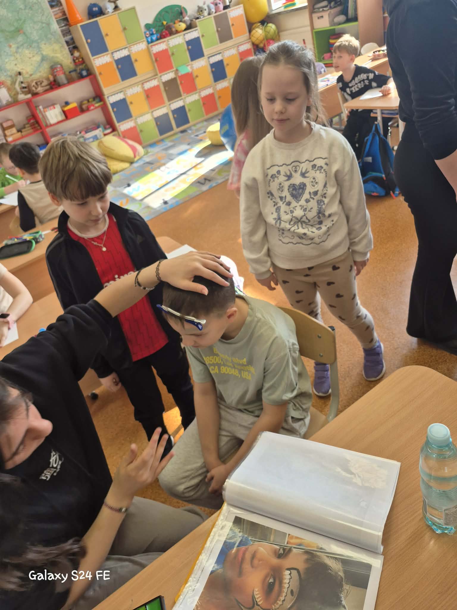 Podczas zajęć uczniowie klasy 1a Szkoły Podstawowej im. T. Kościuszki w Sędziszowie poznali podstawowe narzędzia i techniki fryzjerskie oraz mieli możliwość wykonania prostych fryzur. Nasze uczennice zaplatały dziewczynkom kolorowe warkoczyki, a chłopcom malowały na buźkach maski ich ulubionych bohaterów z kreskówek.